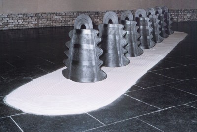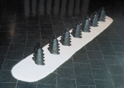 The Dotaku Transmutation Series: Dotaku Shrine is composed of seven (an ideal number for Japanese people) Dotaku forms placed in a straight line on an oblong oval of white raked sand, which provides a contrasting, curved continuum around the objects. The subtly textured surfaces and undulating flat edges of each Dotaku are fabricated and installed so that each appears as an echo of another. The repetitious contours of the black lustrous forms, coupled with an amazing sight line through the arches, pulls one's eyes in, down, around, out and back along the curved furrows of the raked sand in a continuing cycle. This installation, with the black ceramic dotaku combined with the patterned sand is reminiscent of the beautiful dry, Zen gardens located in Kyoto, Japan. As with those lovely gardens, my Dotaku Shrine becomes more than the sum of its parts, creating an environment of repose and calmness that is conducive to introspection and meditation.