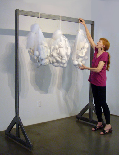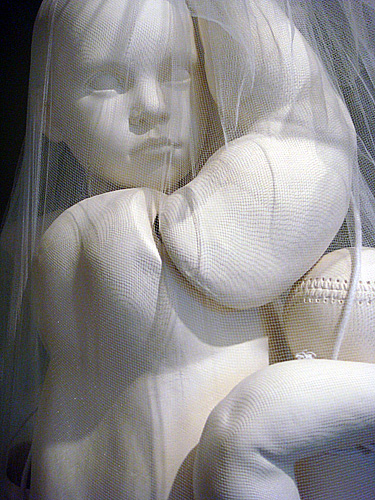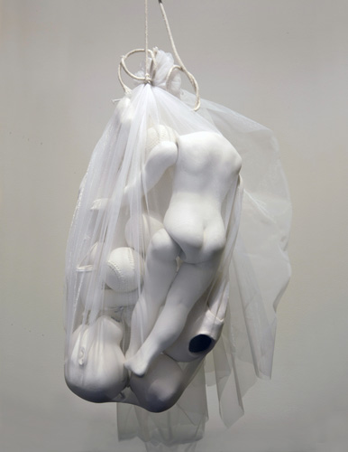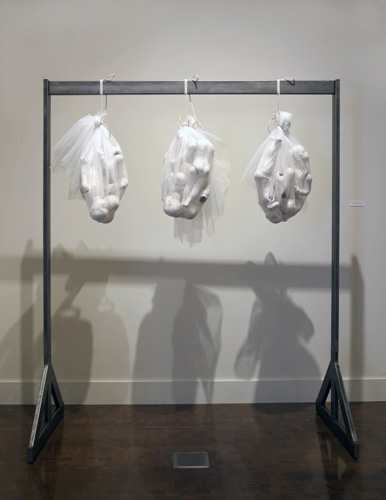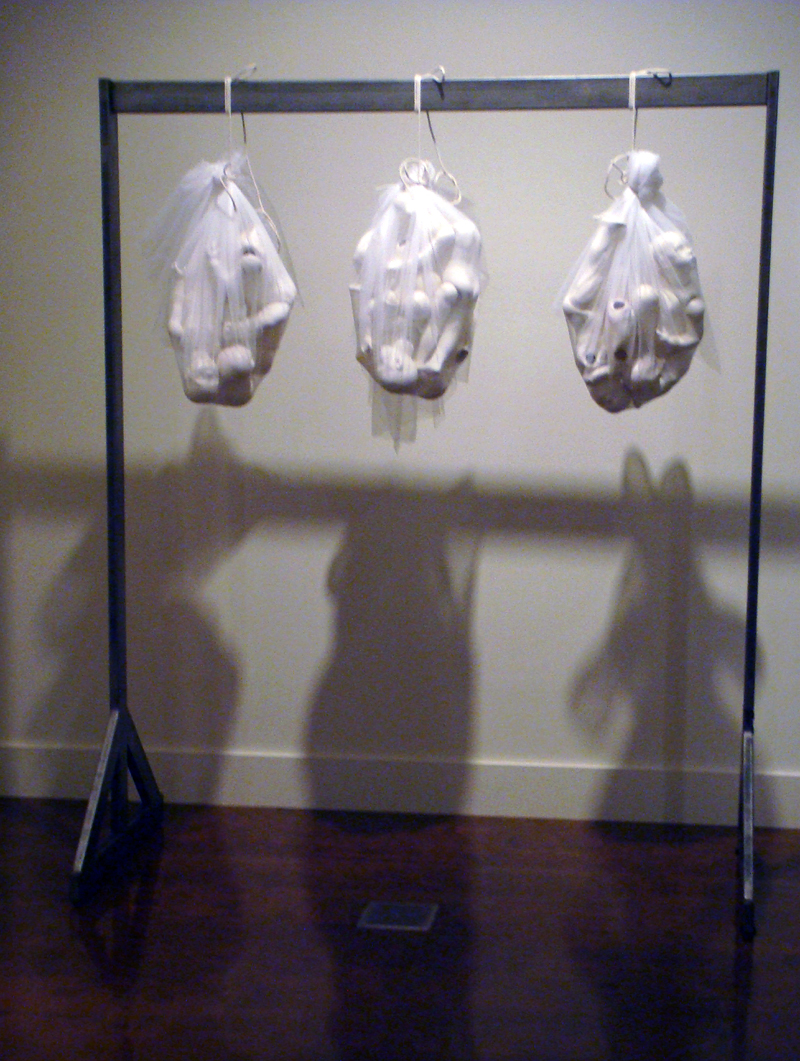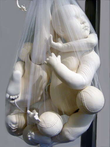 The title is a play on words to describe this large mixed-media installation constructed of clay, fabric and steel. I make reference to human mortality through the concept of play and toys by using suspended ceramic baseballs and ceramic doll remnants as symbols for universal shortcomings and disasters, whether man-made, or from nature. These white objects are a metaphor for the detritus of broken toys, broken lives, and unfulfilled promise from politics, strife, wars, human intervention or natural disasters. Ephemeral shadows cast by each bundle and the repetition of bundles link tangible and intangible associations. These suspended ghostly white bundles allude to the universal cyclical nature of life and death. The installation evolved from its inception to include hand sculpted ghostly ceramic rag dolls, cloth-like in appearance, to compliment the baseballs and doll body parts. The strength and perfection of the brushed steel stand that alludes to a guillotine provides a stark contrast to the soft, ghostly, suspended fabric bundles.