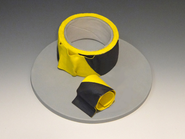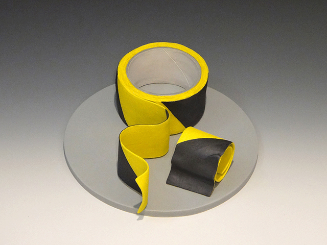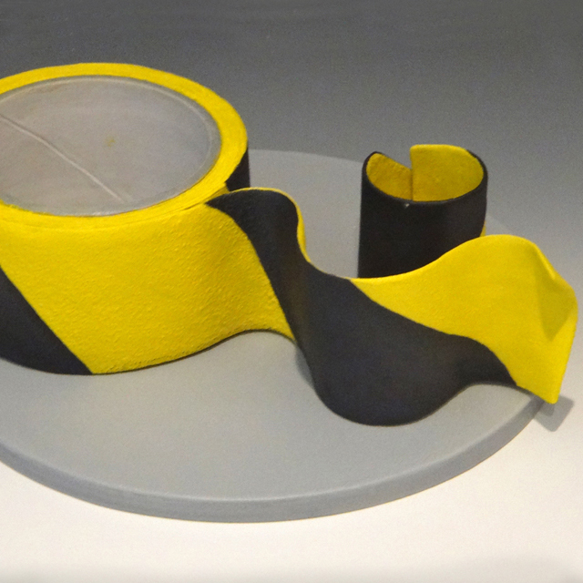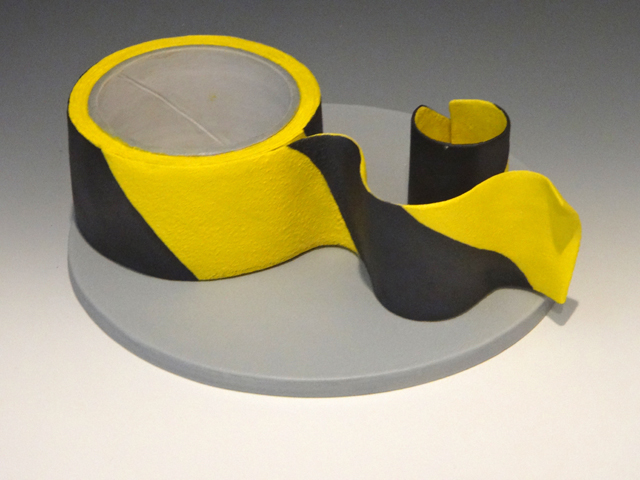 In my next work, “Street Stuff-Caution Tape,” the yellow and black caution tape took on a life of its own; I made three variations of a small ceramic coil of caution tape painted yellow and black, each placed on a gray plaque. Two of these pieces are in the Taipei Museum of XXX and the Hawaiian Museum of XXX, respectively.