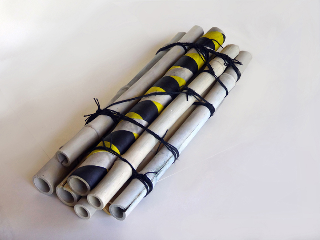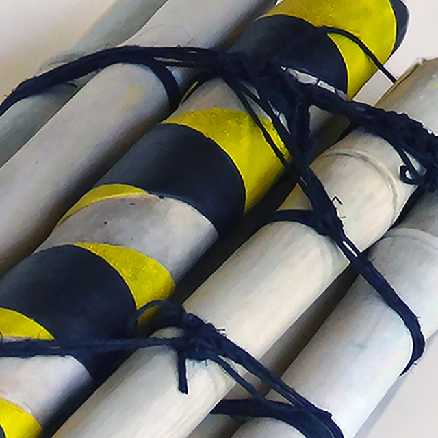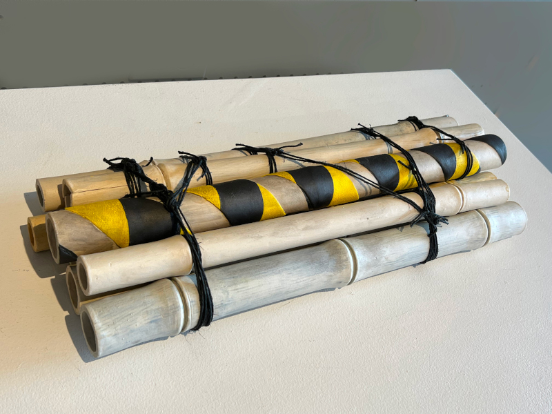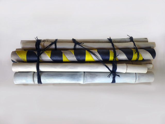 The Street Stuff Series began in Hong Kong, where I frequently saw construction sites with bamboo scaffolds reaching up dozens of stories; at one such site, I saw a bundle of bamboo with one piece wrapped in black and yellow caution tape. In the first work in the series, “Street Stuff-Bamboo,” I thus hand-built a similar ceramic bamboo installation with one piece of bamboo realistically painted with yellow and black caution tape.