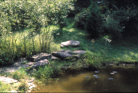 These relatively small disks floating in the pond were a conceptual response to the beautiful Suizenji Jojuen Garden, one of Japan's most famous strolling landscape gardens, built the feudal lord Hosokawa in the 17th century. It is located in Kumamoto City by a freshwater pond fed by a hot spring, and landscaped in a circular pattern for strolling around a miniature Mt. Fuji. In my garden, the articulation of the discrete elements within the field and the sense of the field as a whole emerged (sequentially) only by walking and looking, which are the same principles of time, space and motion in effect at Suizenji.