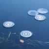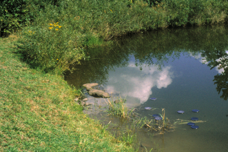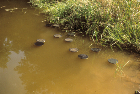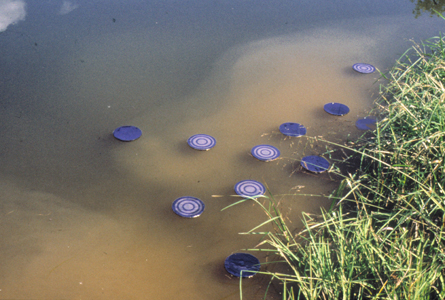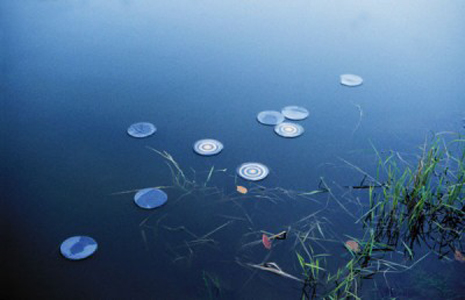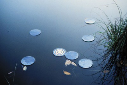This site-specific floating ceramic sculpture installation was among the works featured in the invitational Waterways Exhibition at the Bremer Farm, Otego, NY. The sculpture was composed of 27 black luster-glazed disks installed in three separate, odd numbered groupings of five, nine and eleven. Within each group, there was one or more odd numbered disks banded with golden bull's eyes. The gold and black bull's eye disks were central to each of the three groupings, with the center orb of each forming a physical and metaphorical focal point. Although the disks were anchored with a nylon tether and lead weight, the concentric circles of the bull's eyes and their subtle movement on the water enhanced the quality of motion.