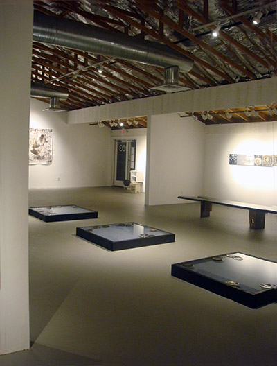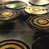 The floating black and gold bull’s-eye ceramic disks, Homage to Suizenji have been re-installed indoors in three pools of water in galerie 103, Kukui'ula, Kaua'i, Hawai'i for the exhibition, "Roberta Griffith + Scott Groeniger," on view from October 10 to December 5, 2015. The Japanese concept of time, space, motion, and use of odd numbers remains similar.