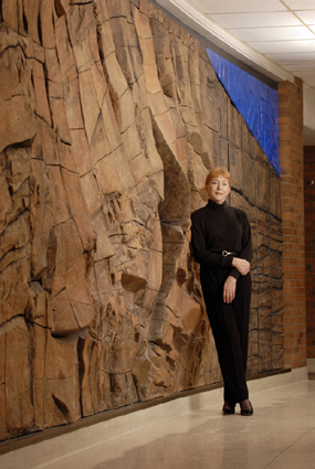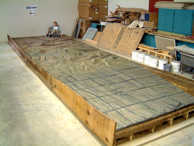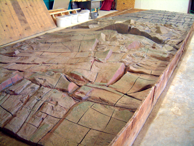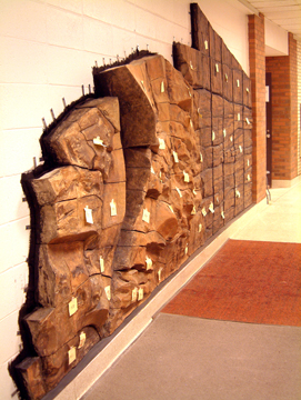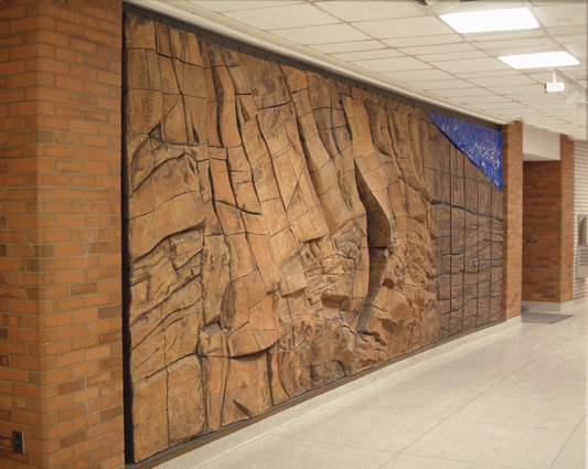 Ever since moving into Anderson Center for the Arts at Hartwick College in 1973, I’ve had the goal of building a ceramic mural outside the ceramic and glass studio. The niche incorporated into the first floor corridor wall for this purpose measures about 8.5 feet high by 25 feet wide. To work with and reveal the earthy and tactile qualities of clay, my design has been inspired by rock outcroppings on the Hartwick College campus near the Johnstone (Miller) Science Center, from rocky areas in upstate New York, and even an image of a moonscape. I have used clay and cast, cut glass to make my vision of the rocky outcroppings and sky, so common to this state, a tangible memory and a persuasive metaphor for the material I’ve used educationally for many years. This metaphor enfolds and encompasses the majesty of our surroundings. I look forward to sharing my vision of how ceramic and glass art may speak to you and to everyone in different ways.