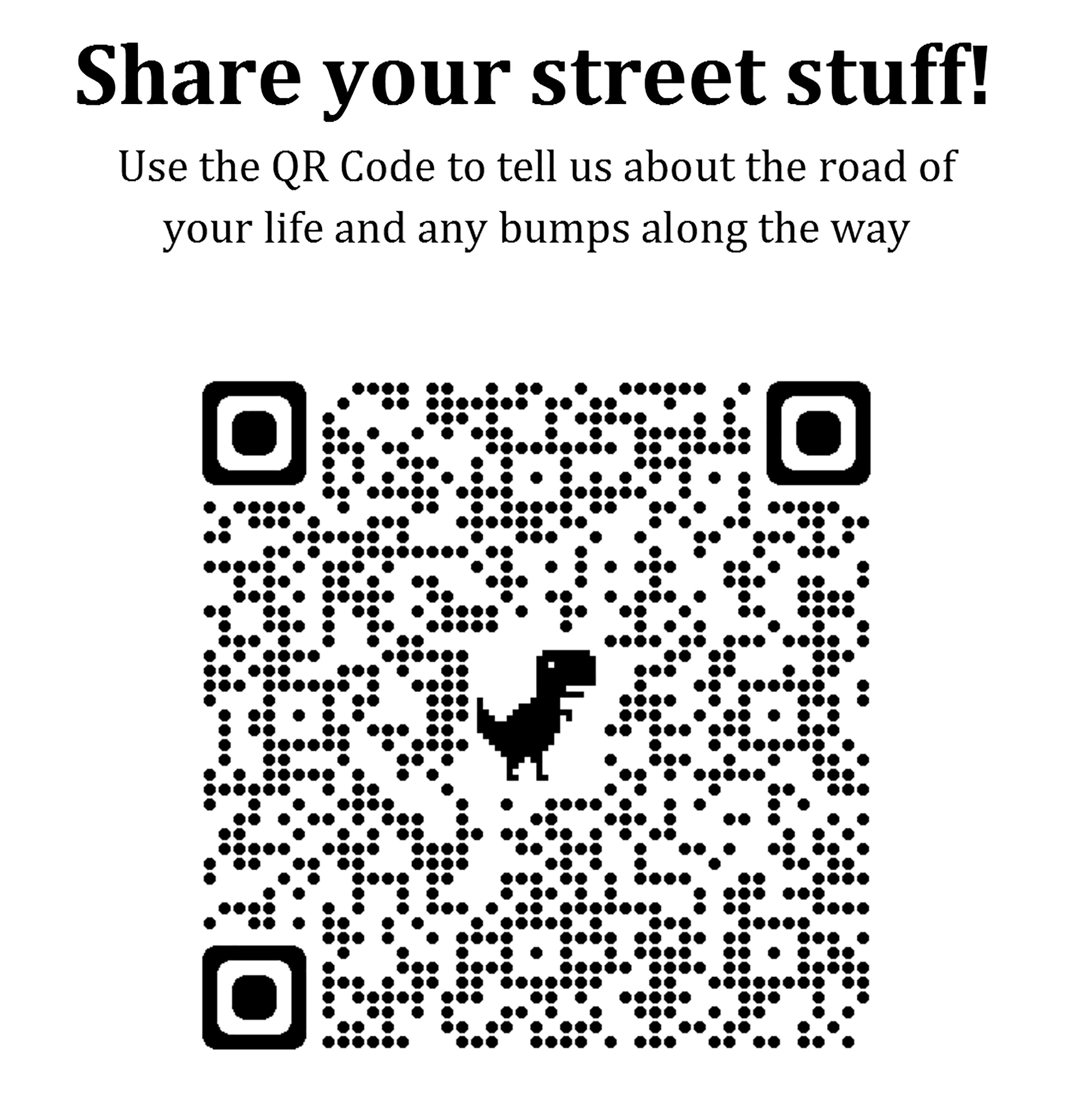 The installation is a visual response by the artist to road signs worldwide. The installation serves as a universal metaphor representing the curves, bumps and other impediments experienced in one’s travels through life. There is a QR Code on the gallery wall for the public to share their thoughts on obstacles they have faced and overcome.
