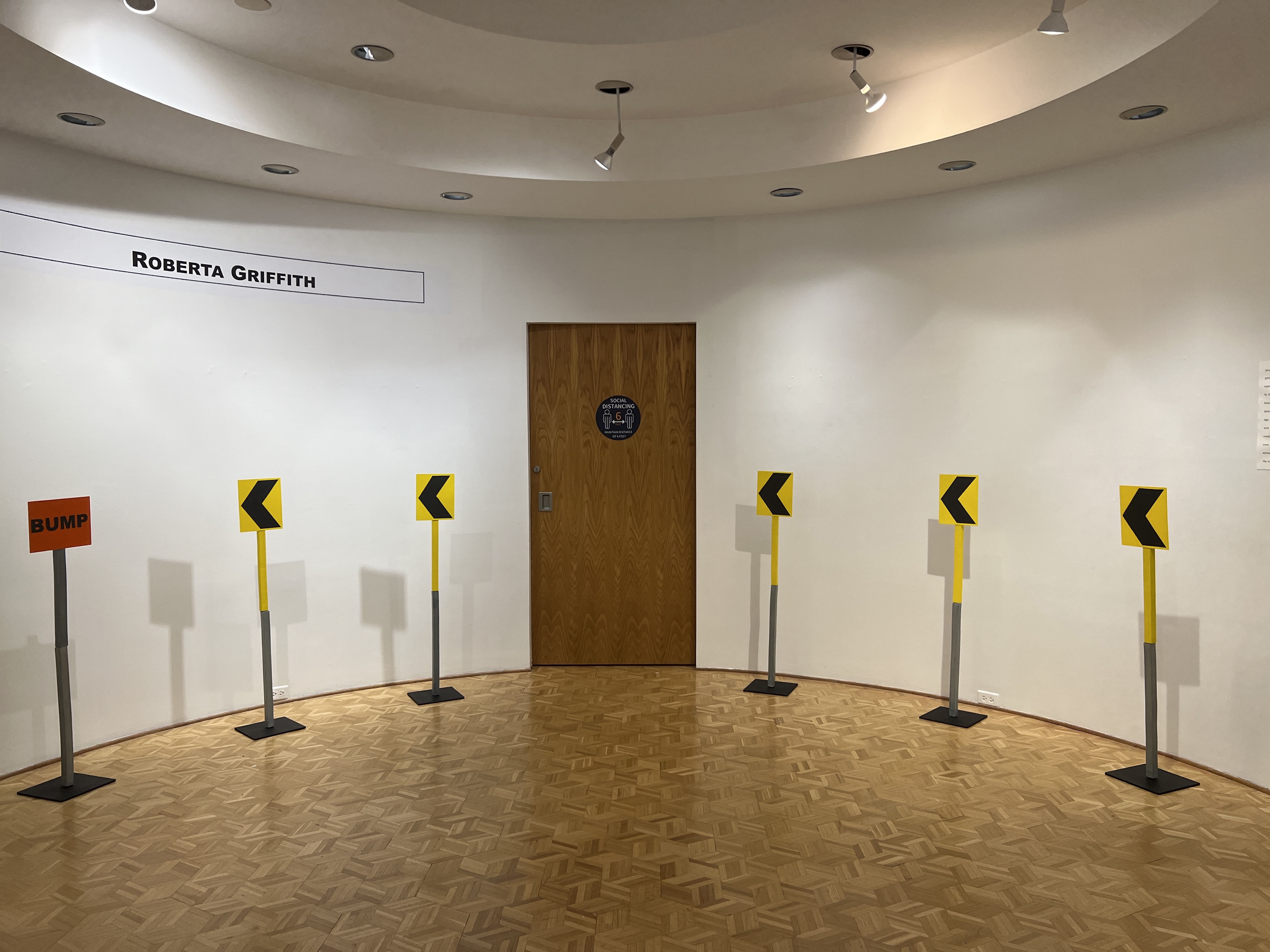 The Yager Museum of Art and Culture Berry Warren Herzog Gallery presents "Street Stuff-BUMP" from April 4 - October 22, 2022. Six realistic porcelain street signs are installed on steel stands placed in the curve of the round gallery.