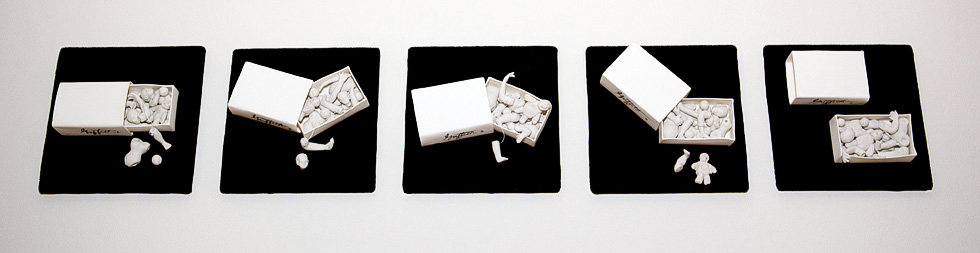 The installation consists of five paper thin unglazed porcelain boxes, matchbox size, displayed on black velvet square pads. Each box contains 19 identical miniature baby doll body parts, baseballs and a rag doll. Each box opens and closes with 19 miniature parts inside of each.