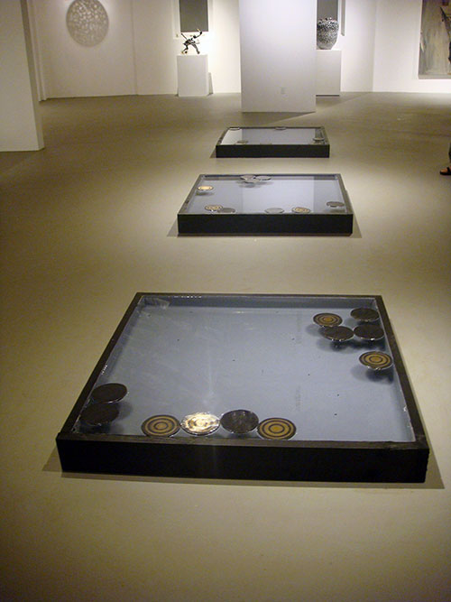 Three mixed-media ceramic installations, including “Homage to Suizenji” that consists of three reflecting pools, each with gunmetal black ceramic disks floating in groups in each pool. The first group has six black disks with one gold bullseye disk, the second group has six black disks with three gold bullseye disks and the third has 11 black disks with five gold bullseye disks.
