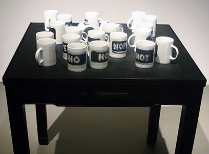 "Unpleasant Conversations" is composed of two mixed media art installations. One is a linear wall installation of forty-six "NO" series plates, "NO", "NOT", "NOPE", and "NO-NO" that are repeated around the gallery on a yellow band, like a cautions tape, with a narrow red line in its center, and a red arrow at the entry. The other installation consists of 21 "NO Series" cups in disarray on a square black table in the center of the gallery.